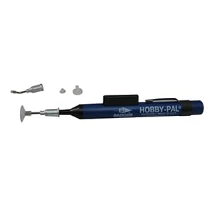 Badger Air-Brush Co. #50-540 Pick-Up Pal (Hobby Pal)– Suction Pick-Up Tool is a must for handling small merchandises. The Hobby Pal is really helpful for any object that has a smooth, non-porous floor. It will deal with glass, plastic, jewelry, metal, decals, stones, covered paper, coated cardboard, puzzle items, and so on. Assorted suction cups and pointers included. Distributed through Badger Company.